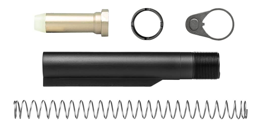 Aero’s M5 308 Carbine Buffer Kit features a Mil-Spec 6-position 7075-T6 aluminum buffer tube, 308 carbine buffer and buffer spring, and end plate & lock nut. Buffer Length 2.5″. Buffer Weight 3.8 oz. Made in America. NOTE: Stock not included.