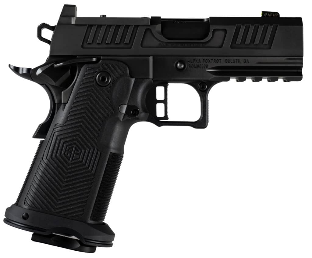 The AF1911 Romulus delivers full-size performance with Alpha Foxtrot’s modern 2011-style engineering. Featuring a black polished DLC finish on the frame and slide; Bull barrel; Night Fision sight; Picatinny rail; ambidextrous thumb safety; flared magwell and is RMSC/RMR optics cut. Includes MOS adapter plate, RMSC and RMR plate, 17rd and 20rd magaine.