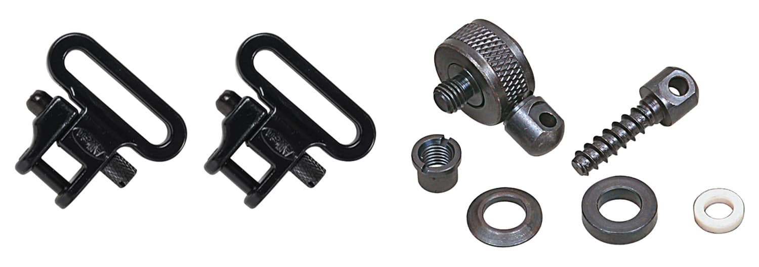 The Shotgun Swivel set comes with two magnum swivels that fit most pump-action and semi-automatic shotguns without hardware installed. The swivels are designed for slings up to 1″ wide. A threaded stud designed for installing into wood or synthetic stocks is included for the buttstock attachment. A rotating stud that requires drilling the factory magazine tube cap is included for attaching to the fore-end.