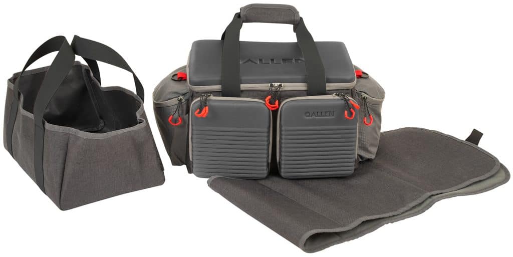 The Competitor Range Bag by Allen allows you to hold everything you need and more. Designed with a large zip around the opening on the main compartment and external zipper pockets allow for the max amount of storage. Five elastic loops hold extra shells or choke tubes. The included rollout gun mat allows you clean and assemble or disassemble your firearms on a protective mat. The adjustable shoulder strap and webbed carry handles make for easy transport even when the rage bag is fully loaded. The case also includes an internal tote for organization or shell caddy that can be removed.