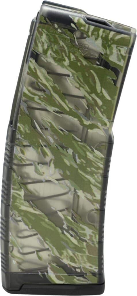 Stand out at the range with the perfect fusion of style and substance – the AR-15 magazine that goes beyond the ordinary. Upgrade your gear and make a statement with our custom printed Tiger Stripe magazine today. FEATURES: 30-round magazine. 5.56/.223 compatibility. Sturdy, impact-resistant polycarbonate with textured grip. 4 way anti-tilt, self-lubricating follower. Heavy-duty, non-memory, and non-corrosive stainless steel spring. Made in the U.S.A.