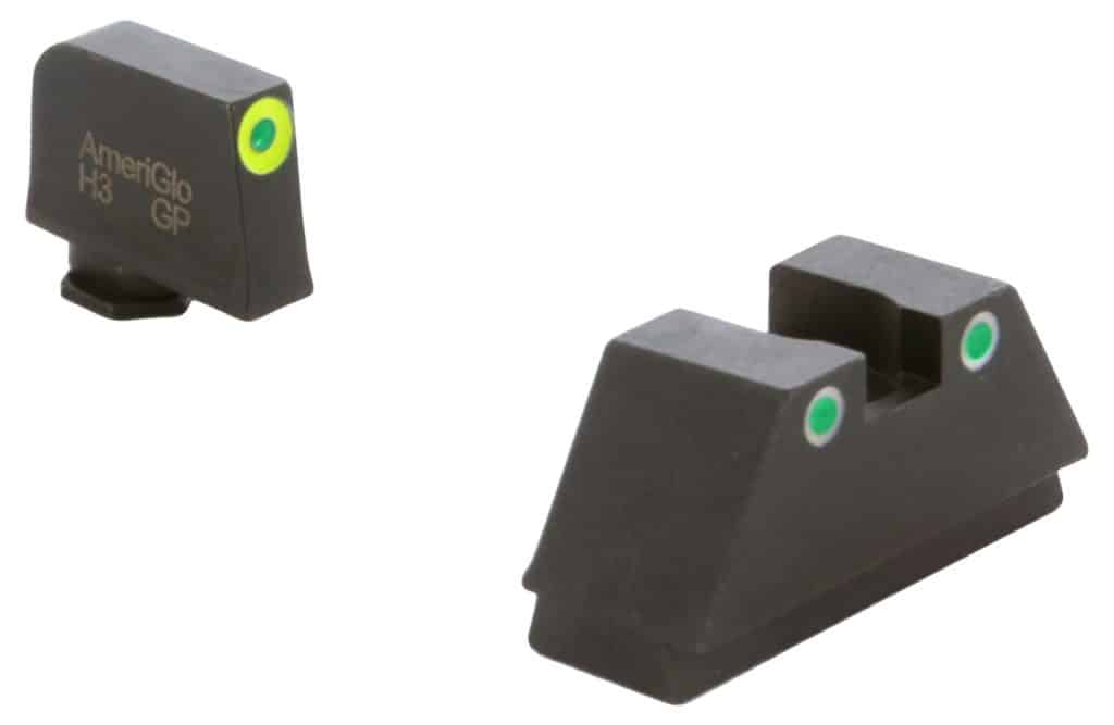 AmeriGlo brings a clear advantage to your shooting experience on and off the range. AmeriGlo Optic Compatible Sight Tall Suppressor Sights set provide a precise, elevated co-witness sight picture for slide-mounted red dot optics and suppressors and serve as reliable back-up sights. This XL Tall model has a green tritium front sight with lumigreen outline and green tritium rear sight with white outline and black finish. It is compatible with all Glock Gen 1-5 models except: 42,43,43X & 48. Fits Glock MOS slide. Compatible with Aimpoint Acro, Holosun 509T, Steiner MPS footprints.