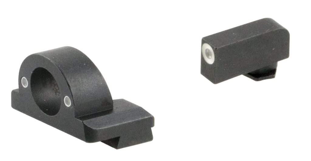 AmeriGlo brings a clear advantage to your shooting experience on and off the range. The Ghost Ring Sight is the preferred sight for shooters seeking an alternative to traditional post and notch sight design. It utilizes an aperture style rear sight with two tritium mini-dots and a bright tritium front sight providing quick front sight acquisition. This model has a green tritium with white outline front, green tritium rear, and black finish. Does not fit Glock MOS slide.