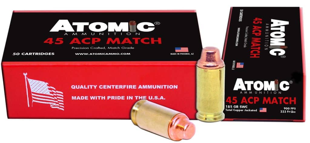 Atomic Ammunition’s match ammunition is made with only the very best components available, such as reloadable brass cases, double-based, clean burning powder, and total copper jacketed bullets. Specifications: 45 ACP/185 gr/Semi Wadcutter (SWC)/50 Per Box/10 Cs