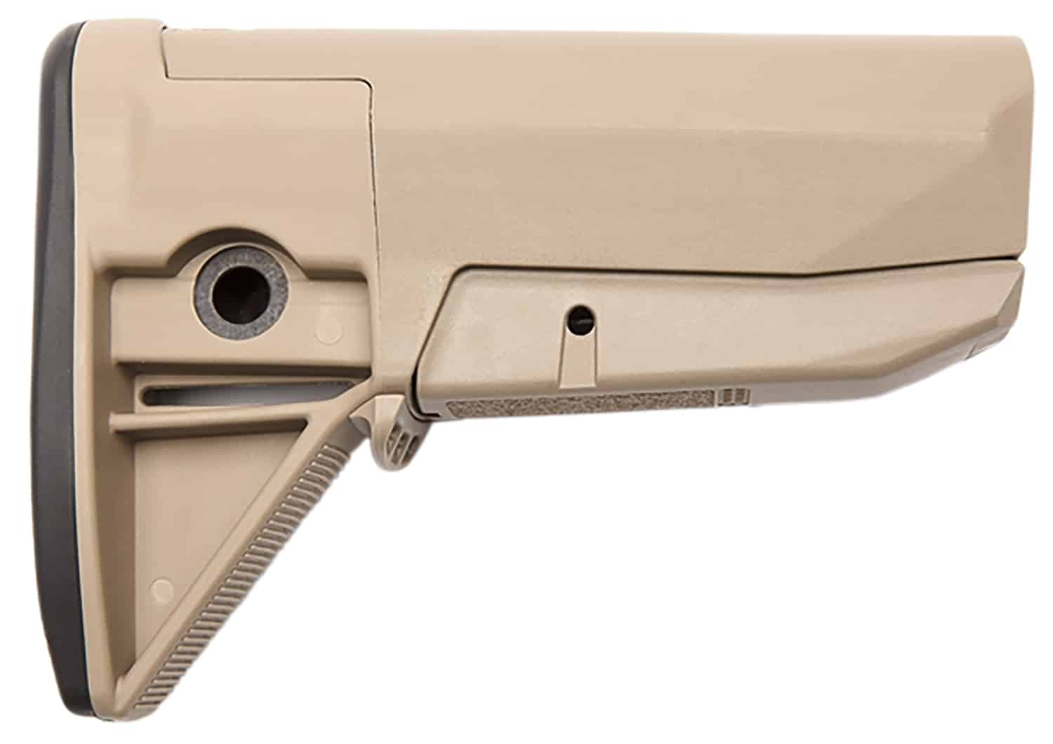 The BCMGunfighter Stock kit has a strong light-weight polymer stock for a mil-spec receiver extension. It features a snag free design, a modular VBOST (Vehicle Borne Operations Sling Tab), two different types of ambidextrous sling mounting options, including QD swivel sockets, a BCM 7075T6 Mil-Spec receiver extension, locking M4 nut, Mil-Spec carbine action spring, carbine buffer, and a BCM QD swivel mount end plate.