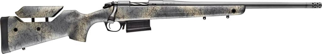 The Wilderness Series tackles the need for rifles that can withstand the rugged and unforgiving wilderness while blending into those very same elements, hence Bergara’s hand-painted camouflage stocks with added webbing for increased texture and grip. All Wilderness Series barreled actions feature Sniper Grey Cerakote finishes for advanced protection in extremely harsh weather. Featuring a Terrain molded stock with mini-chassis, this rifle is also outfitted with a Bergara Performance Trigger and a 5 round (3 round: 6.5 PRC) AICS style detachable magazine. The world-renowned (#5.5) Bergara barrel features a seamless, omnidirectional, and multi-ported muzzle brake that will reduce felt recoil by up to 35 percent. The Terrain is complemented by Bergara’s super-smooth B-14 Action, which is a two-lug system with a sliding plate extractor and a coned bolt nose and breech to ensure smooth feeding and extraction of the cartridge. It has been factory drilled and tapped to fit Remington 700 style rings and bases and includes QD flush cups in the stock to allow for easy attachment and detachment of slings.