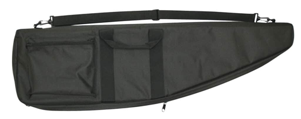 Bob Allen’s 36″ Black Tactical Rifle Case is water resistant, made of coated poly with poly webbing and an external storage pocket (10X9). The case has self healing nylon zippers, foam padding and poly webbing carry handles and shoulder strap.