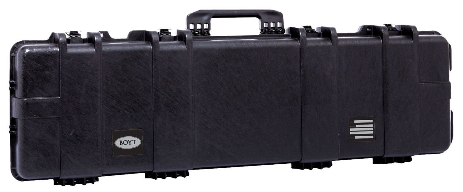 Boyt Harness Company’s Single Long Gun Case is water resistant and dust proof with a O-ring full length gasket. The case utilzies egg crate foam, 4-draw latches, collapsible, comfort grip handle, and carry handle. The Single Long Gun Case is padlock compatible and made in the USA. The Single Gun Case is padlock compatible This model has a black finish and interior dimensions of : 48″ x 9″ x 4″.