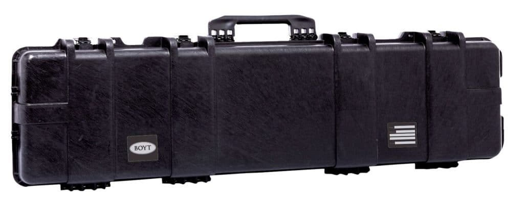 Boyt Harness Company’s hard-sided travel case is designed and engineered to meet or exceed law enforcement, military and airline standards. The H-Series is constructed of high 120D no break polypropylene and features a water resistant and dust proof o-ring full length gasket, stainless steel ball bearing wheels, and pressure relief valve. The case is padlock compatible, has collapsible, comfort grip handles, and meets most standard airline luggage/TSA requirements. It is padlock compatible. This model holds two rifles, has a black finish, and internal dimensions of 51″ x 15″ x 6″. Made in the USA.