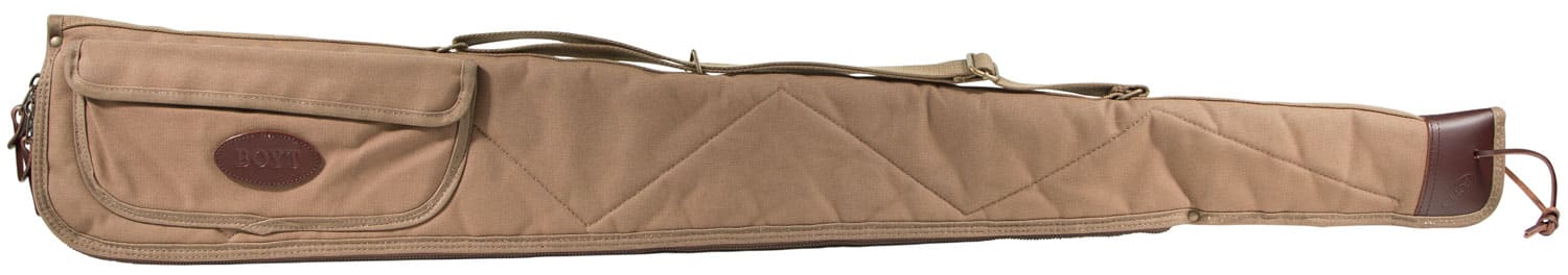 Boyt’s Alaskan Shotgun Case features a waxed canvas shell with flannel lining, breathable non-compressible batting and brass hardware. It utilizes #10 brass zipper, lockable, double zipper pulls, heavy-duty web sling and spine and has an accessory pocket (10″ x 4.5″) with elastic loops for choke tubes.