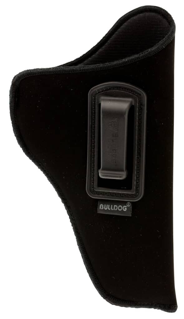 Bulldog’s Deluxe Inside the Waistband Holsters offer a uniquely fused padding and vapor barrier that help keep the weapon dry and protect the skin from the pistol’s curves and sharp edges. This holster features a special spiral binding that minimizes discomfort when worn directly against the skin. The smooth inner lining offers a snag-free draw while the suede-like outer material is comfortable and itch free. Its molded polymer clip can be worn over the pant top or belt. Fits revolvers w/3-4″ barrels/