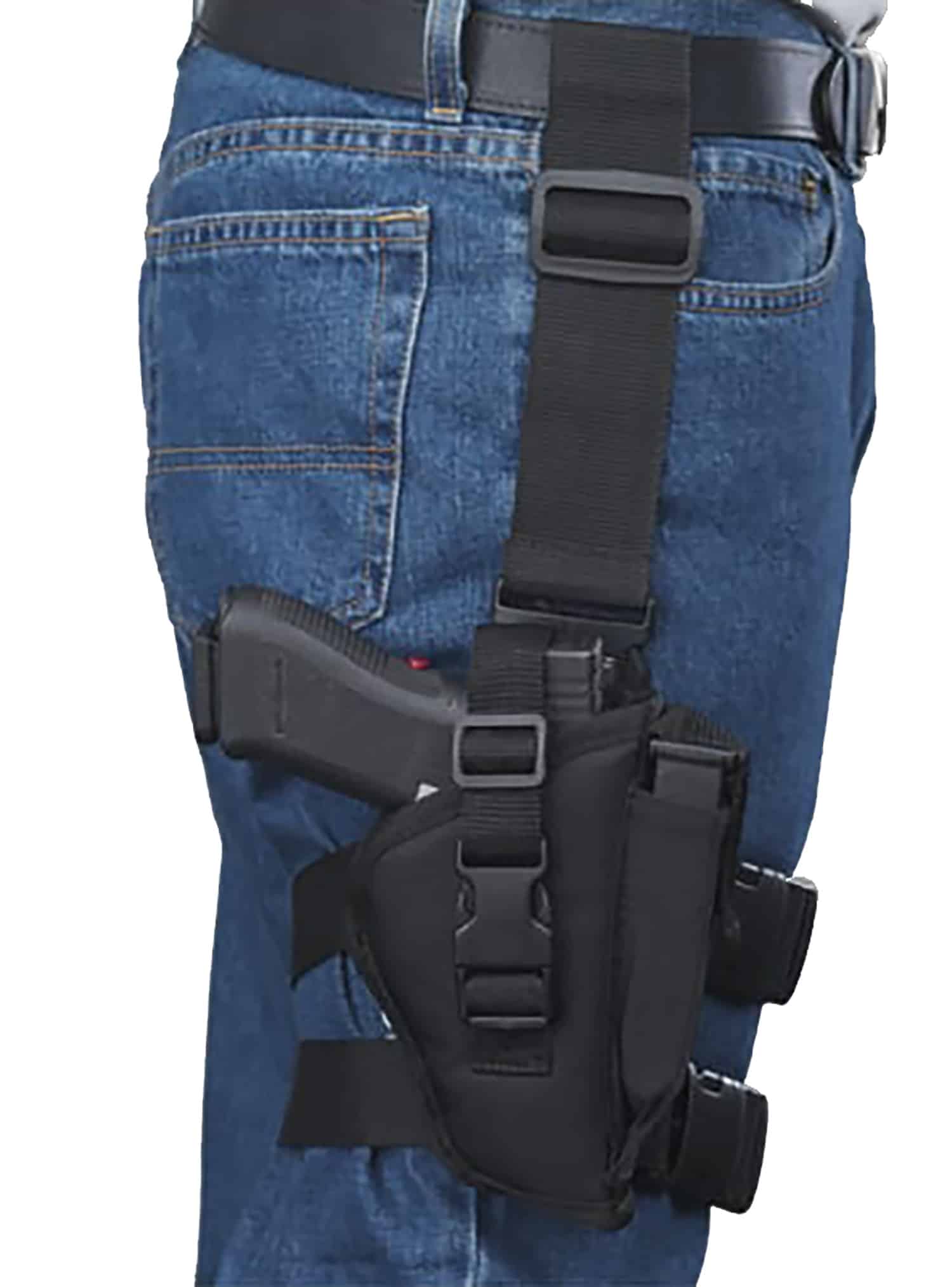 Black Tactical Leg Holster features an adjustable belt loop and leg strap for custom fit. Adjustable over strap includes mag pouch for automatics.