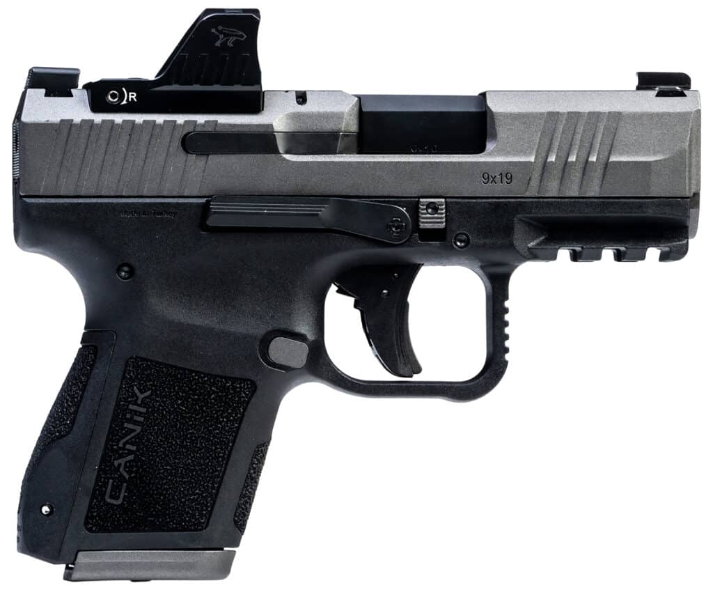 Canik Mete MC9 Sports South Exclusive 9mm Luger 15+1/12+1 3.18″ Black Tenifer Cerakote Optic Ready/Serrated Steel Slide, Tungsten Cerakote Polymer Frame w/Picatinny Rail, MeCanik M01 Red Dot