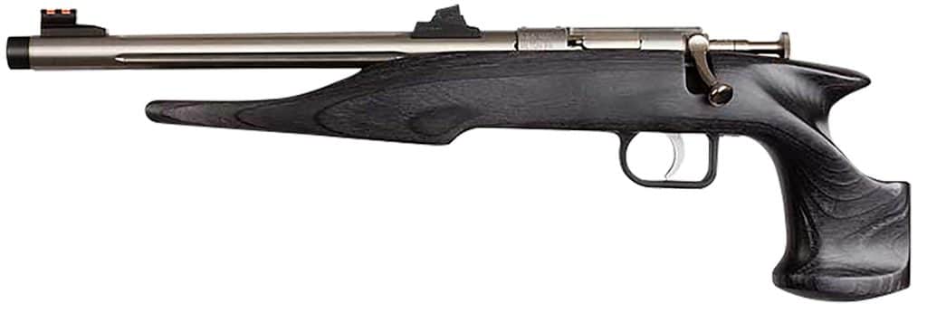 The Chipmunk Hunter Pistol is a manual cocking, single shot, bolt action traditional hunter pistol. Features a metal cocking knob; Williams Fire sights, adjustable rear and Fiber Optic metal front; safety- rebounding firing pin automatically blocked to prevent accidental discharge; comes factory threaded with 1/2-28 threads and cap.
