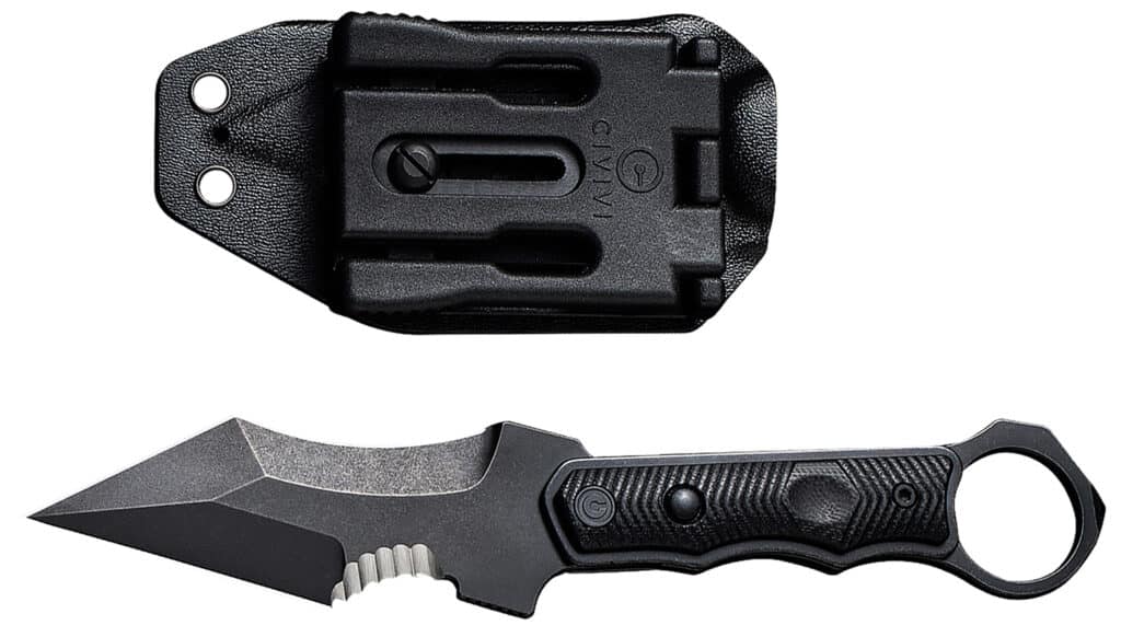 The Civivi Orthrus is a dual position fixed knife featuring a Straight/Karambit blade, glass breaker, textured G10 handle with finger ring. Includes Kydex sheath.