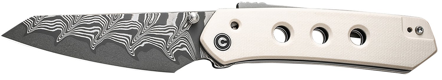 The Civivi Vision FG features a 3.54″ Damascus blade, ivory handle with three holes, SuperLock close and thumb stud open. Includes pocket clip.