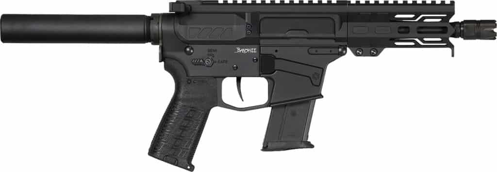 CMMG 57A9A0FAB Banshee MK57 5.7x28mm 20+1 5″ Black Nitride Medium Taper Threaded Barrel, M-LOK Handguard, Black Armor Cerakote Aluminum Receiver w/Picatinny Rail, Black Pistol Tube, CMMG Zeroed Grip