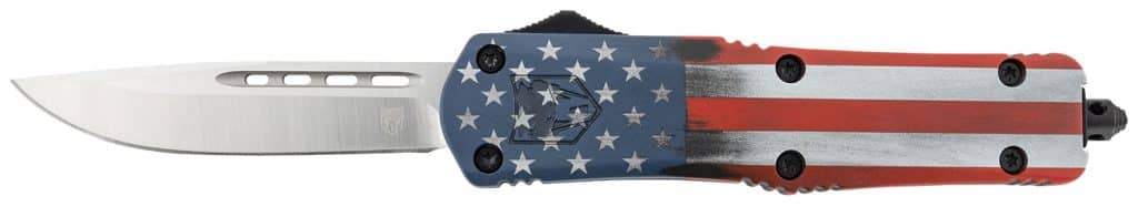Our medium FS-3 Cerakote US Flag starts from a high-grade aluminum alloy handle and features a D2 steel blade. The Cerakote ceramic coating enhances abrasion/wear resistance, corrosion resistance and chemical resistance to the handle. All knives are dual action (blade deployment and retraction are powered by pushing or pulling the same control switch). This knife features a pocket clip, a glass breaker for emergencies and includes a nylon sheath.