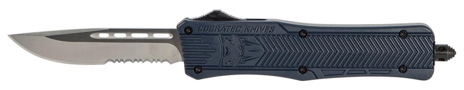 CobraTec Knives MNYCTK1MDS CTK-1 Medium 3″ OTF Drop Point Part Serrated D2 Steel Blade/NYPD Blue Aluminum Handle Features Glass Breaker Includes Pocket Clip