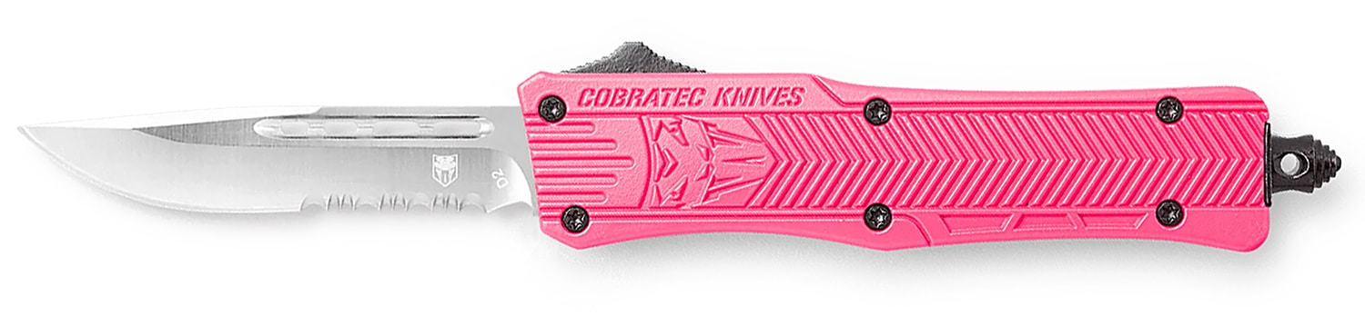 CobraTec Knives SPKCTK1SDS CTK-1 Small 2.75″ OTF Drop Point Part Serrated D2 Steel Blade/ Pink Aluminum Handle Features Glass Breaker Includes Pocket Clip
