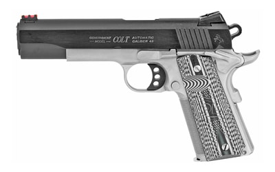 A true competition 1911 that’s ready for the battle against the timer, flashing two finishes for the best of both worlds. This two-tone update features a corrosion-resistant brushed stainless steel frame crowned with a blued slide. Custom G10 Black and Grey grips, 25 LPI checkering on the front strap and MSH, an upswept beavertail grip safety, and undercut trigger guard keep the pistol low and controlled in your hands. The dual recoil spring system reduces felt recoil while extending recoil spring life. This pistol also features a Colt National Match Barrel and Novak adjustable fiber optic sights for precision shooting. Our Series 70 Firing System ensures a clean crisp trigger pull. Available in 45ACP.