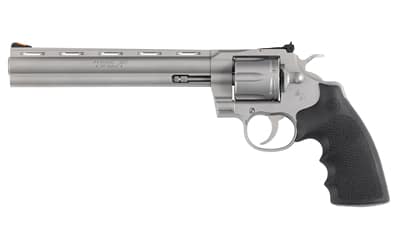 The Python is back! Building on Colt’s Snake Gun legacy, the legendary double-action revolver returns in stainless steel in a 8″ barrel length. The 2020 Python features modern stainless steel alloys and a re-designed rear sight. Thirty percent more steel beneath the rear adjustable target sight gives you a stronger revolver and more robust shooting experience. A recessed target crown, user-interchangeable front sight, and Walnut grip with the iconic Colt medallion make this a gun you’ll want to shoot AND show off. The Python is chambered in .357 Magnum and also accommodates .38 Special cartridges.