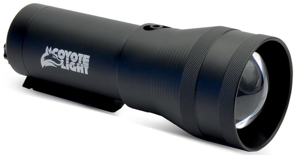 The ultimate high-performance predator hunting light! Coyote Light Pro can be hand-held or mounted to either a gun scope or monopod for the ultimate in versatility. High-performance solid state LED is rated to 65,000 hours and features up to 48 hours of continuous run time. Light-up predators eyes at over 1,000 yards. Integrated Picatinny rail for mounting on a gun or scope. The ultra-fast variable focus adjusts from spot to flood light in less than 1/4 turn.