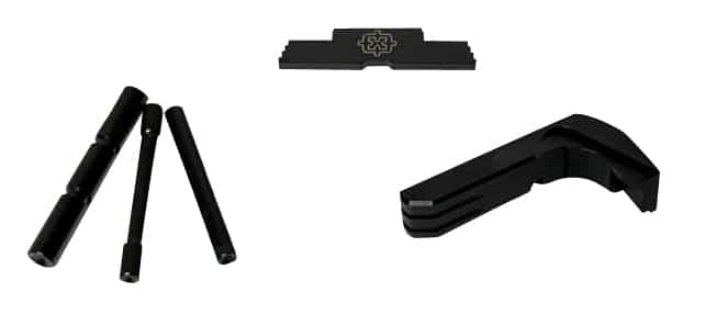 Cross Armory Glock 3 Piece Kit contains Dimpled Pin Set, Extended Magazine Catch and Extended Slide Lock. The Slide Lock and Pin Set is made of 4140 Steel, the Magazine Catch is made of Aluminum. Does not intefere with gun holster. Compatible with Glock 17/19/20/21/22/23/26/27/29/30/31/32/33/34/35/40/41 Gen4.