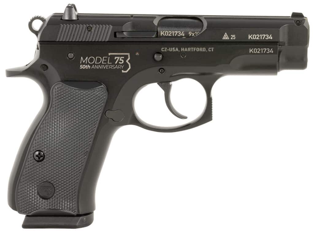 CZ-USA 91122 CZ 75 Compact 50th Anniversary 9mm Luger 15+1 3.75″ Black Steel Barrel & Serrated Slide, Black Polycoat Steel Frame w/Beavertail, Black Plastic Grip, Right Hand