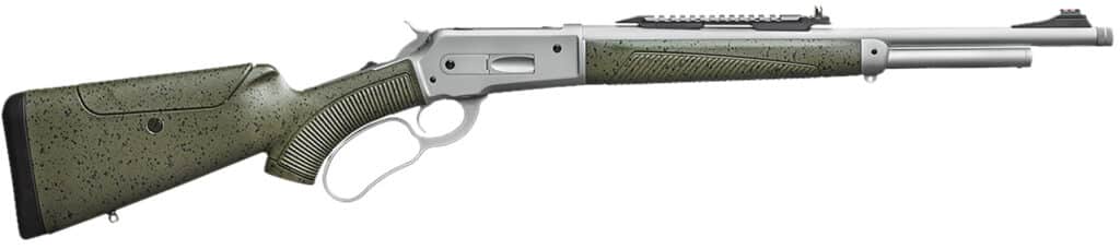 Davide Pedersoli is proud to introduce the Guidemaster-X. A 45-70 Lever action built on the 1886 action. The Guidemaster-X brings modern styling to a classic 86/71 action. Featuring a silver Cerakote finish, green synthetic stock with adjustable cheek piece and a threaded barrel.