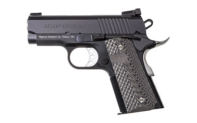 All Desert Eagle 1911 series 70 slide and frame rails are machined to aerospace tolerances, delivering accuracy that will match any custom gun. Offered in both Chrome Moly and Stainless and feature stainless match barrels, G-10 grips, light triggers with zero creep, and a stainless beavertail grip safety. The G (5″ barrel) and C (4.33″ barrel) models are equipped with fixed combat sights and the Undercover U (3″ barrel) models come with an adjustable rear sight. Desert Eagle 1911s chambered in 45 ACP all have a traditional feed ramp machined into the frame, while all 9mm pistols have a ramped barrel with fully supported chamber. Only the 1911G models have a traditional barrel bushing in the slide. The 1911C and U models feature a bushingless slide and bull barrel. With the shorter slides of the C and U models, the bushingless slide allows for a longer recoil spring and ensures reliable function. Includes two 6-round magazines.
