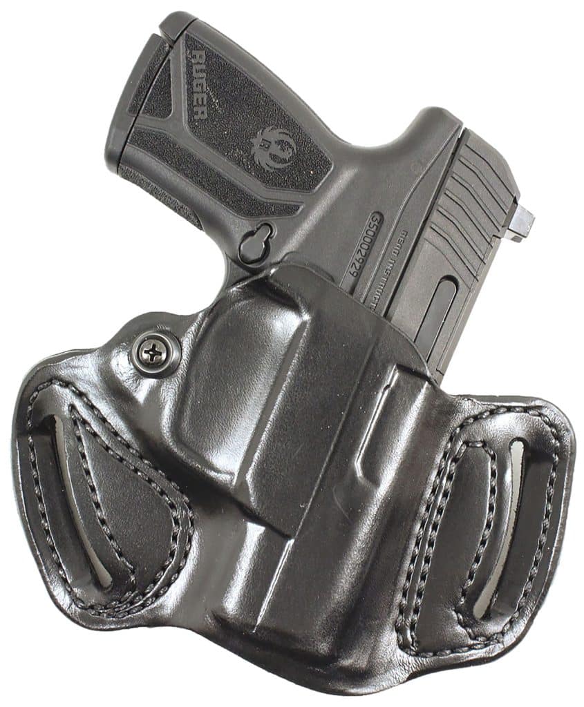 The Mini Slide is a premium saddle leather, double seams and a highly detailed molded fit. It features an adjustable-tension device. Available in black or tan unlined leather. Belt slots are 1 3/4″ wide.