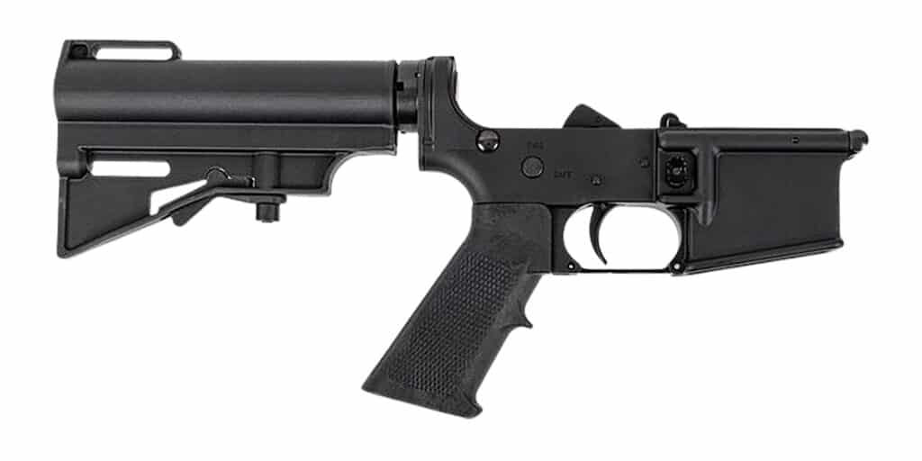 The forged lowers are made using 7075-T6 aluminum and are marked “MULTI” for caliber. Finish is hardcoat anodize.. Mil-spec diameter 7075-T6 buffer tube is hardcoat anodized, has 6 adjustment positions, is fitted with a DPMS CAR-15 injection molded pistol brace. The fire control group is a DPMS Retro black Oxide, single-stage assembly.