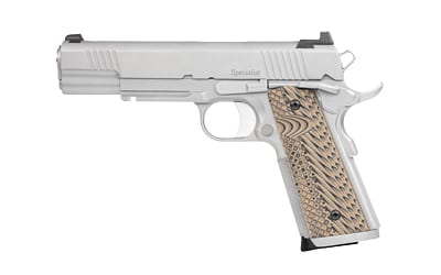 A full-size 1911, the Specialist is chambered in .45 ACP, 10mm, or 9mm and loaded with features to satisfy a public servant’s special requirements. The forged stainless steel slide wears their inverted top rib with a single amber tritium dot in the rear sight and a green lamp with a white target ring in front. The frame sports an integral 1913 Picatinny, 25 LPI front strap checkering, undercut trigger guard and recessed slide stop to enable the installation of laser grips. Equipped with an ambidextrous thumb safety, extended magazine release, and detachable magwell, the Specialist is operator-friendly. It is finished off with a set of G10 VZ Operator II grips that force the hand into the beavertail and hold it there.