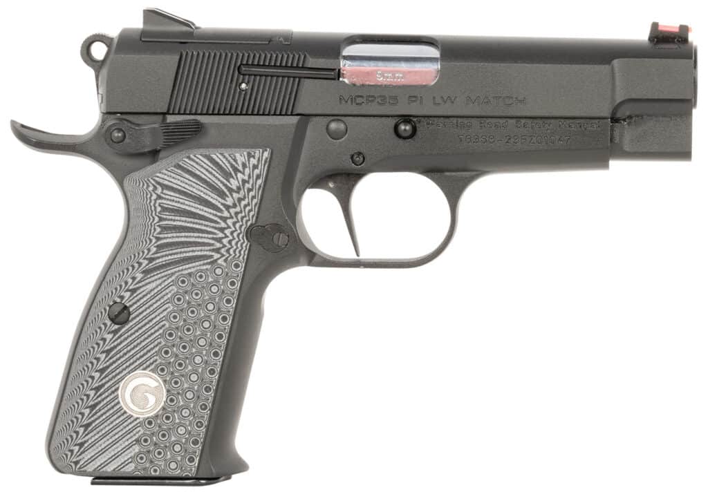 EAA Girsan MCP 35 with a lightweight aluminum frame that has the fit, feel and design of the legendary John Browning creation. At almost a 1/2 pound lighter than the traditional Girsan High Power. Equipped with an optic-ready slide featuring an RMS/RMSc footprint, the Girsan High Power Light-Weight comes with the most innovative features like an aluminum alloy frame, G10 grips, ambidextrous safeties, extended beavertail, straight trigger, no magazine disconnect, fiber optic front sight and a double-stacked magazine.