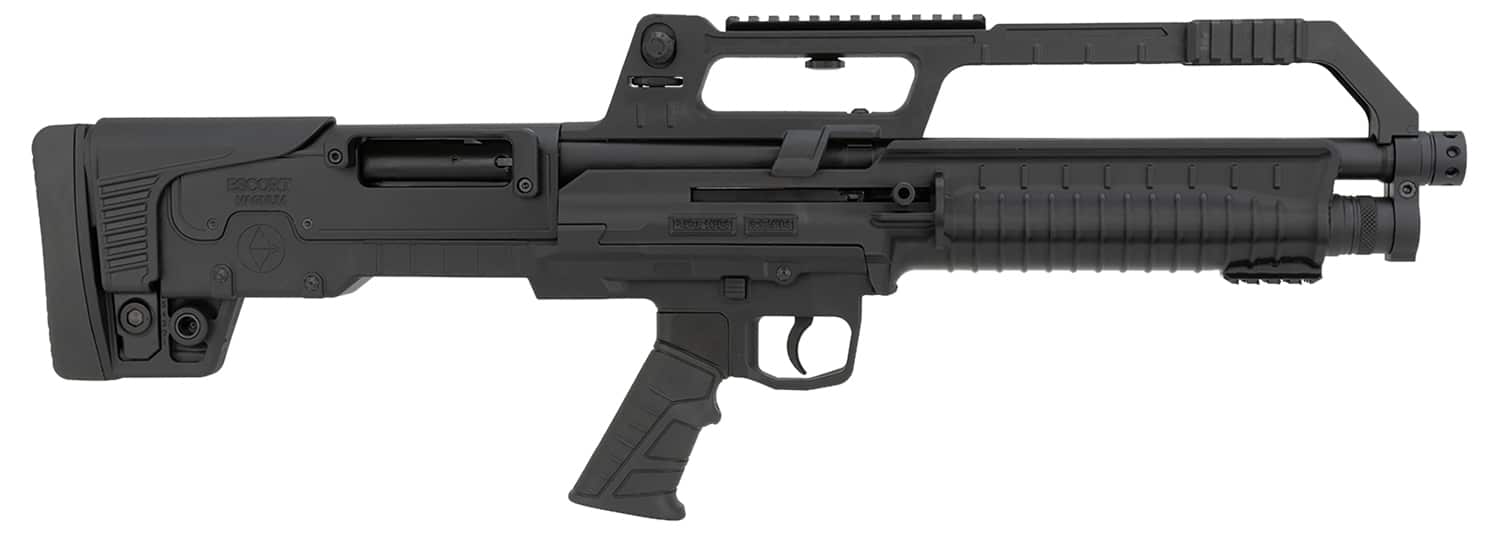The Escort BullTac semi-auto action shotgun is a sporting, security and law enforcement companion. The purpose-built bullpup shotgun features an 18″ barrel for shot or slugs; synthetic stock; side accessory rails on the carry handle; Picatinny optics rail; detachable carry handle; adjustable rear sight, fixed front sight; QD sling mount; Fixed cylinder choke and manual cross button safety.