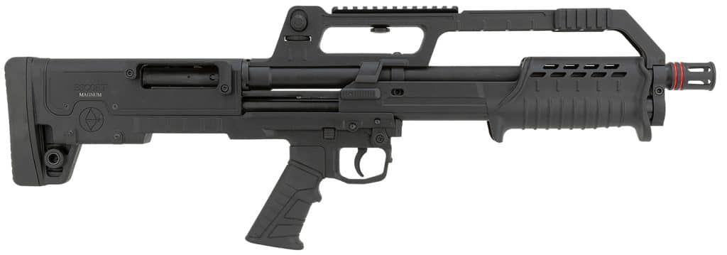 The Escort BullTac pump action shotgun is a sporting, security and law enforcement companion. The purpose-built bullpup shotgun features an 18″ barrel for shot or slugs; synthetic stock; side accessory rails on the carry handle; Picatinny optics rail; detachable carry handle; adjustable rear sight, fixed front sight; QD sling mount; Fixed cylinder choke and manual cross button safety.