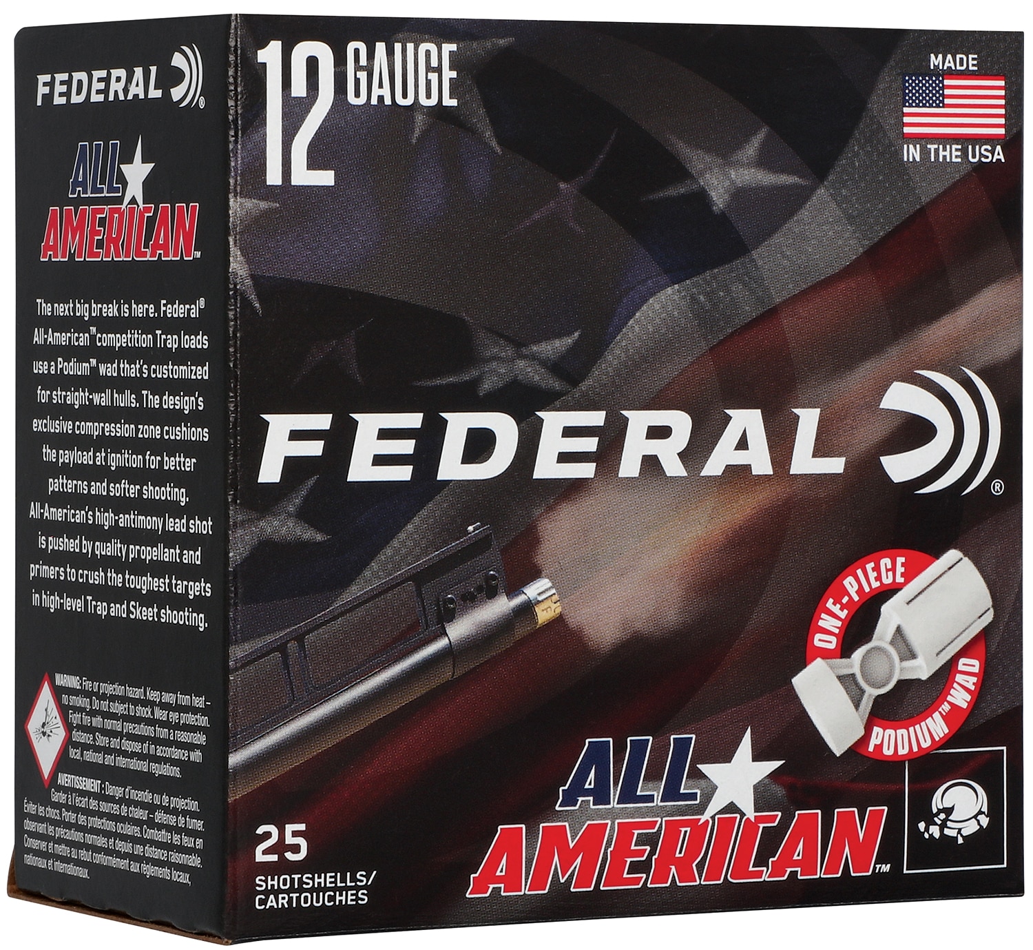 New Federal All-American is engineered to win competition Trap events with a Podium wad that’s customized for straight-wall hulls. The designs exclusive compression zone cushions the payload at ignition for softer shooting. High-antimony lead pellets strike the perfect balance of hardness and density, providing the energy needed to break distant clays while resisting deformation and maintaining pattern efficiency. Pushed by Federals high-quality propellant and legendary primers, All-American crushes the toughest targets in high-level Trap and Skeet shooting.