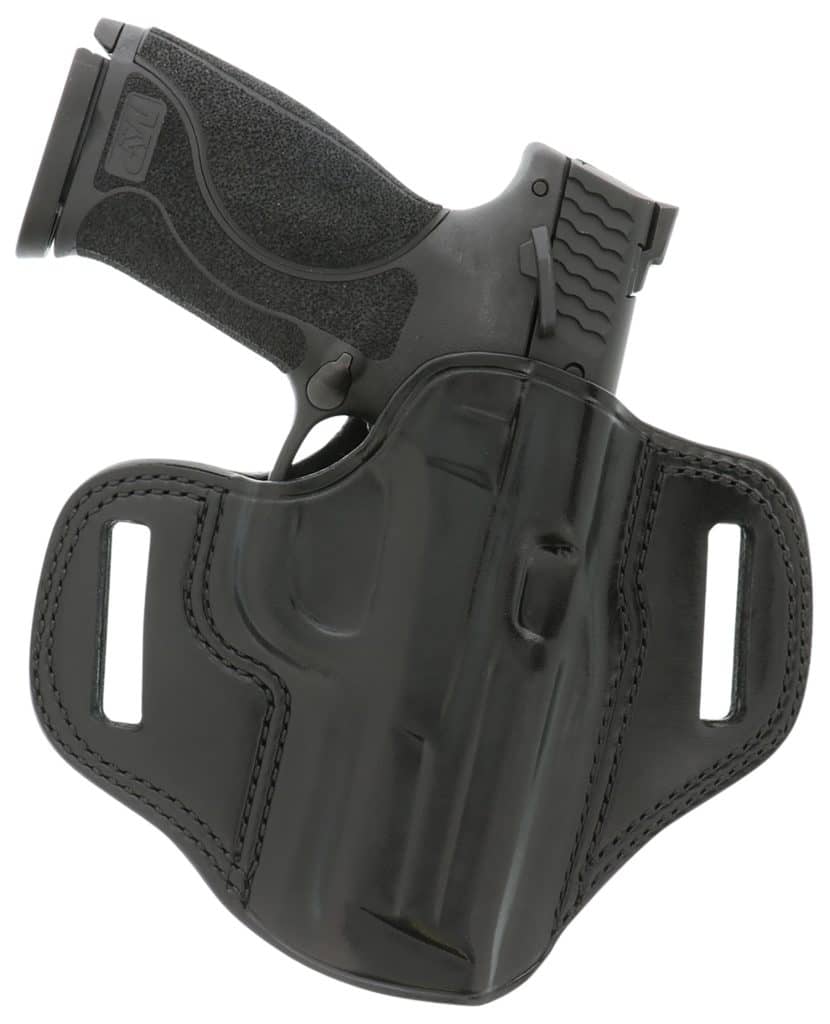 The Combat Master is a professional-grade belt holster hand-molded to fit specific handguns. Its traditional high-riding pancake-style design places the belt slots on either side of the holster, pulling the handgun tight to the body and making defensive handguns disappear under even light clothing. It features an open top with firing grip accessibility for speed. The twin belt slots fit belts up to 1.75″ wide. Glock 17 Gen1-5/22 Gen2-5, 31; Ruger Security-9 w/o thumb safety.