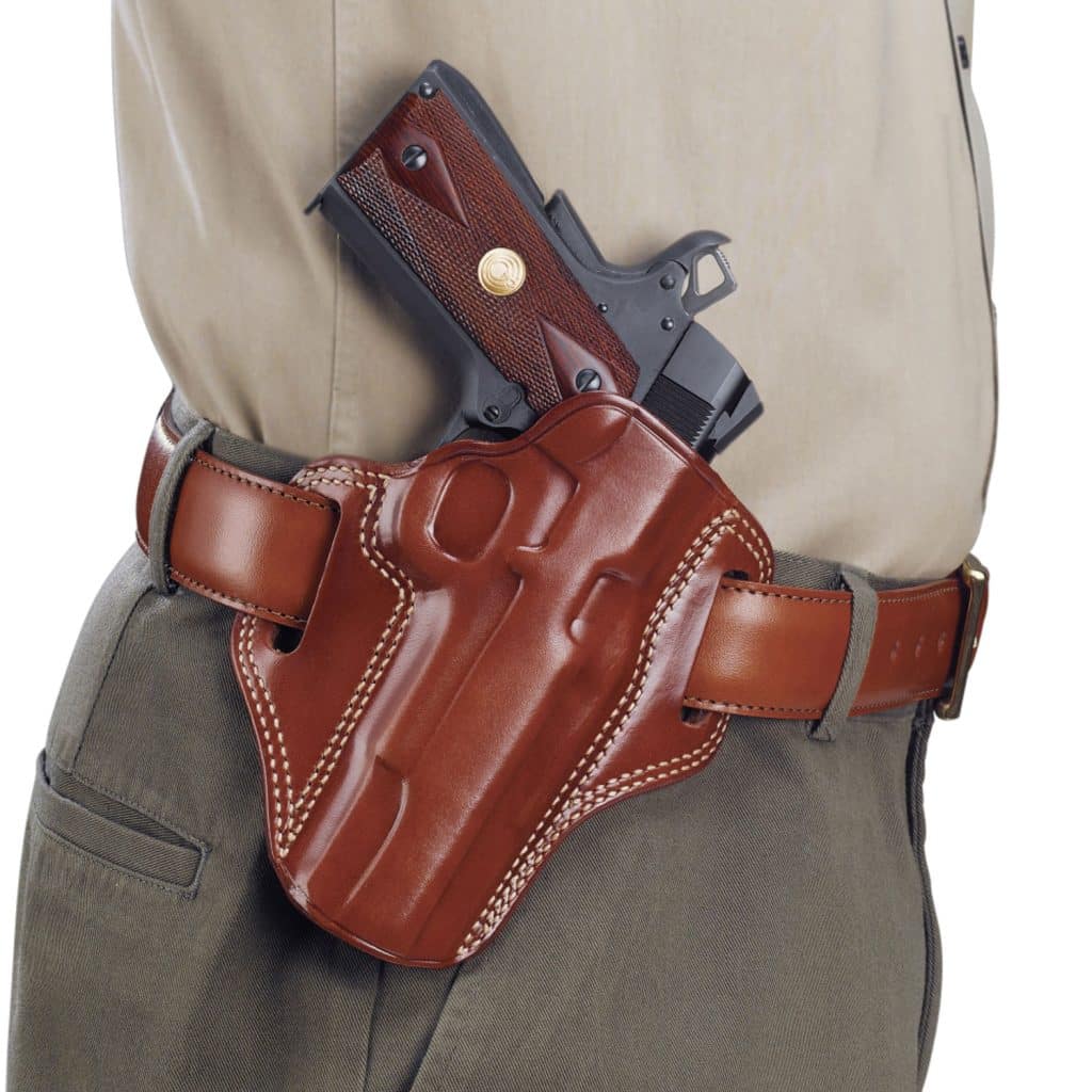 The Combat Master is a professional-grade belt holster hand-molded to fit specific handguns. Its traditional high-riding pancake-style design places the belt slots on either side of the holster, pulling the handgun tight to the body and making defensive handguns disappear under even light clothing. It features an open top with firing grip accessibility for speed. The twin belt slots fit belts up to 1.75″ wide. Fits CZ P-10M; Glock 43/43X; Springfield Hellcat; Taurus GX4.