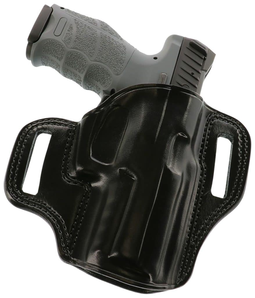 The Combat Master is a professional-grade belt holster hand-molded to fit specific handguns. Its traditional high-riding pancake-style design places the belt slots on either side of the holster, pulling the handgun tight to the body and making defensive handguns disappear under even light clothing. It features an open top with firing grip accessibility for speed. The twin belt slots fit belts up to 1.75″ wide.