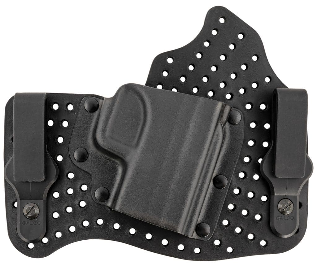 A cooler alternative to Galco’s best-selling KingTuk IWB, the patented KingTuk Air provides a level of comfort previously unknown with broad-plated IWB holsters. The ventilated backing plate combined with a rigid Kydex holster pocket provides extreme comfort along with fast draw and easy holstering. Its removable metal belt clips can be moved up or down in the corresponding holes in the leather, enabling the user to set the carry height and angle to suit their unique preferences.