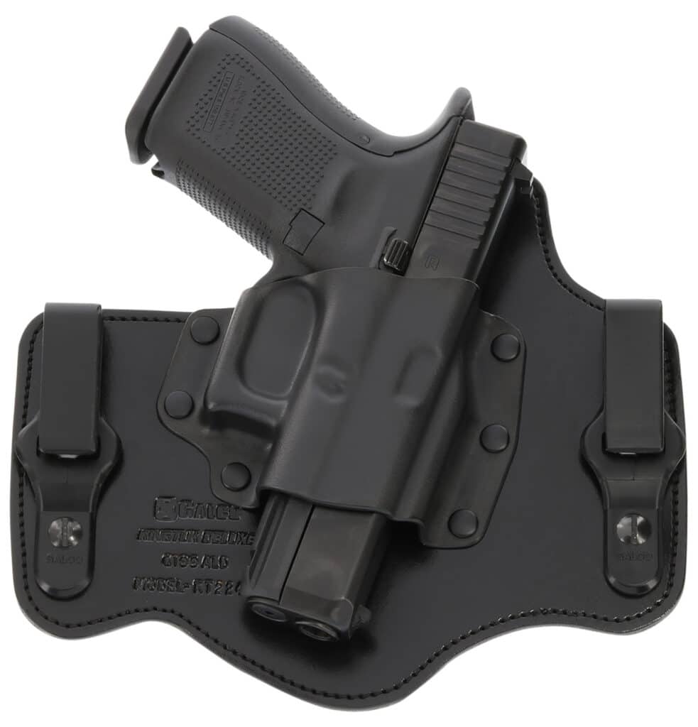 Galco’s KingTuk Deluxe tuckable IWB reigns supreme in comfort, speed and versatility. It provides a comfortable backing plate made of saddle leather and lined with Premium Center Cut Steerhide, with a rigid Kydex holster pocket for a fast draw and easy holstering. It includes Galco’s patent-pending polymer UniClip and Ultimate Stealth clip designs for excellent concealment, stability and easy on-off capability. The clips can be moved up or down in the corresponding holes in the leather, enabling the user to set the carry height and angle to suit their unique preferences. Fits CZ P10C, P10F; Glock 17 Gen1-5, 19 Gen1-5, 19X, 22 Gen2-5, 23 Gen2-5, 26 Gen3-5, 27 Gen3-5, 31, 32, 33, 45; Ruger Security-9 Compact w/o thumb safety, Security-9 w/o thumb safety; ZEV Tech O.Z-9 standard and compact only.