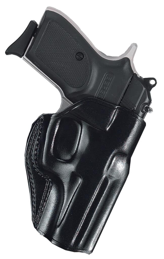 Galco’s Stinger Belt Holster is made to carry a small semi-automatic pistol behind the strongside hip. It has an open top and forward cant which will allow a fast, easy draw stroke. Safety, security, and stealth are all addressed with a covered trigger guard, deep molding, and a tunnel-style belt loop that takes up little belt space compared to a normal pancake-type holster. The Stinger is constructed of black premium saddle leather and fits belts up to 1.5″ wide. This model is compatible with Colt Mustang; Kimber Micro 380; Sig P238.