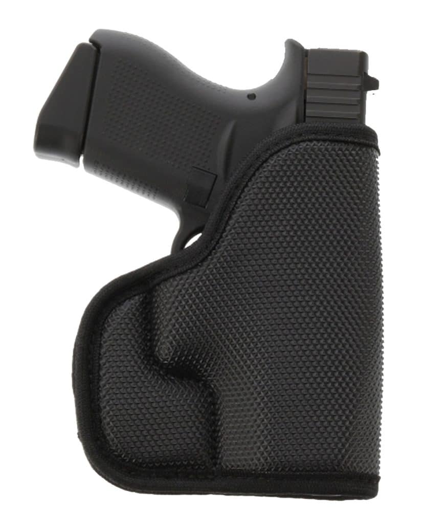 The StukOn-U is designed for front pocket carry in pants or a jacket. It keeps the firearm in the same general position so the grip can be quickly located during draw, conceals the shape of the gun so that its outline is not printed through the pants and allows one-handed release of gun from both pocket and holster, especially when using a hooking draw technique to catch the edge of the holster on the pocket as the handgun is released. The holsters Gripper Shell surface assists in keeping the holster in the pocket during the draw. Fits Colt Mustang; Kahr P380; KelTec P32, P3AT; Kimber Micro 9, Solo 9mm; Ruger LCP, LCP II; Taurus 738 TCP.