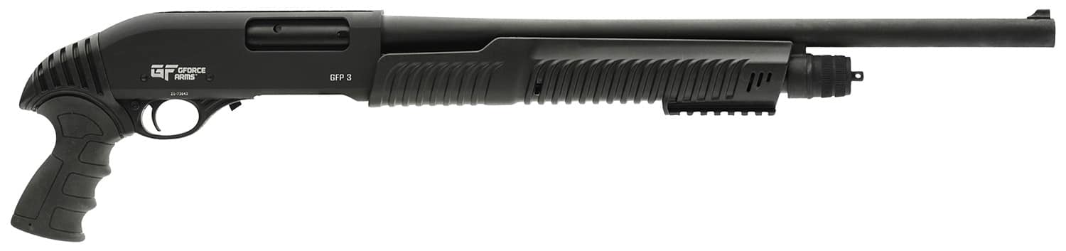 The GForce GFP3REX is 2″ & 3″ shotshell compatible with 4+1 capacity. Features a fixed cylinder bore; fixed front blade sight; sling swivels; synthetic pistol grip; forend Picatinny Rail and a 5-6lb trigger pull. Includes standard buttstock.