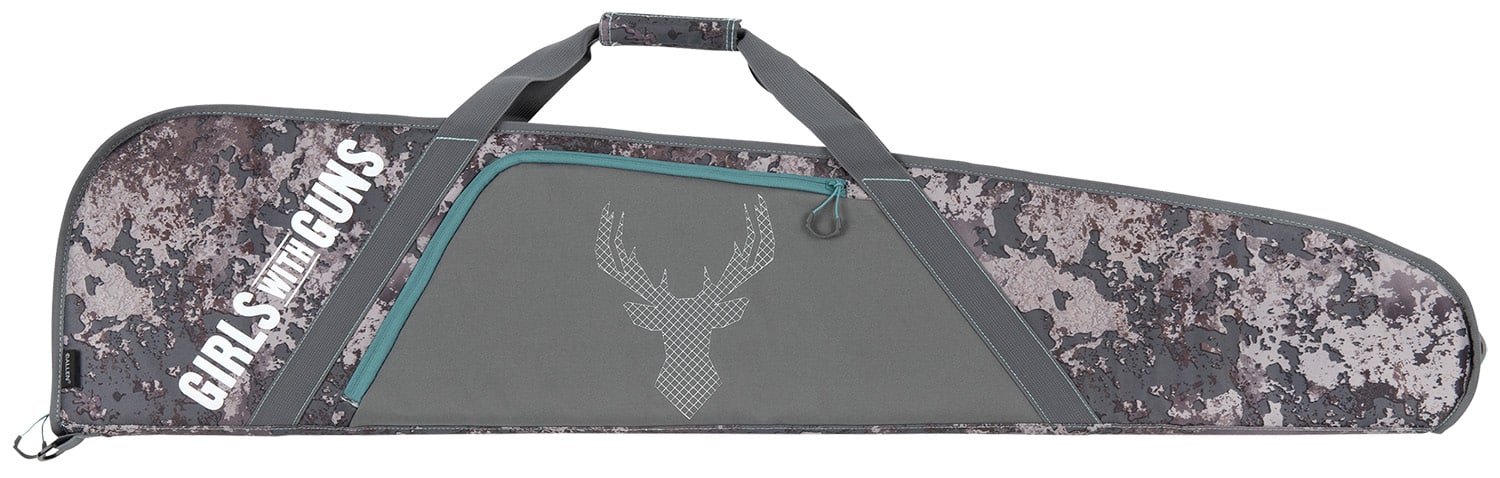 Girls With Guns Ten Point Dreams rifle case features a large front zip pocket, handle wrap with hook and loop closure, hanging loop with D-ring, heavy-duty foam and a lockable zipper.