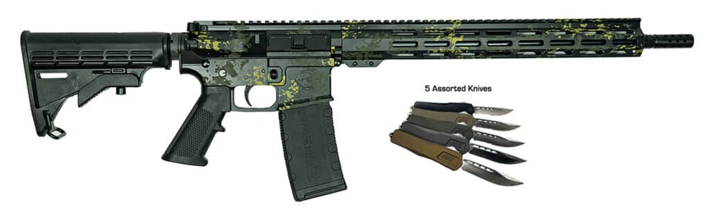 Great Lakes Rifles features an M-LOK Rail; aluminum billet upper and lower receiver; threaded barrel; Cerakote finish; polymer grip and trigger. Includes one magazine and 5 assorted SKU’s of Out The Front style knives that feature a 3.50″ D2 Steel blade and a 4.50″ 6061 Aluminum Grip. These come with glass breakers, belt clip and feature a premium Cerakote finish in these colors- Black, Tungsten, Bronze, FDE, and/or OD Green. They may be serrated or smooth blades.