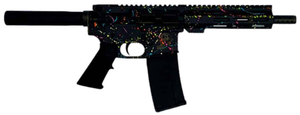 Great Lakes Firearms Saved By The Splatter features a black, threaded 4150 CRMOV Nitride heavy barrel; No brace, pistol buffer tube only; .223 Wylde calibers shoots .223 Rem and 5.56 NATO; M4 feed ramp; black Mil-Spec polymer grip; black oxide 0.750 Gas Block and Pistol Gas Tube; muzzle brake designed to be 6 degrees forward, wrench tightened w/o Loctite; Picatinny rail and a trigger pull of 5.5-6 lbs. Includes one magazine and muzzle brake.