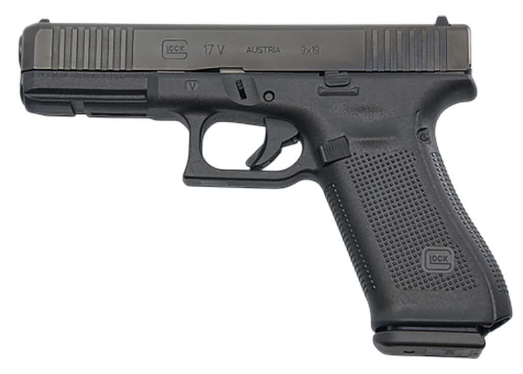 Glock PV1750201 G17 V Standard Frame 9mm Luger 10+1 4.49″ Black GMB Barrel, Black nDLC Steel Serrated Slide, Black Polymer Frame w/Accessory Rail, Textured Polymer Grip, Ambidextrous